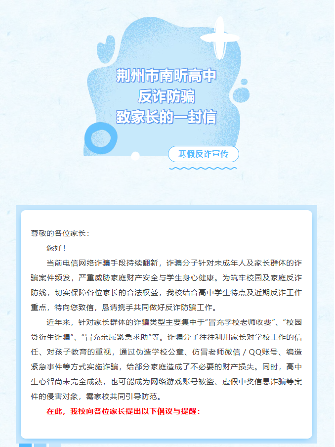 荆州市南昕高中反诈防骗致家长的一封信